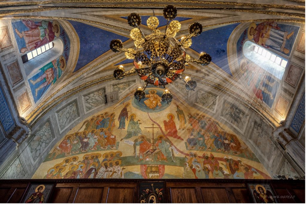 L’inscription « OIKOS THEOU » au-dessus de la porte d’entrée signifie « maison de Dieu », rappelant que l’église est l’incarnation des cieux sur terre et manifeste la présence permanente du Royaume de Dieu dans le monde.
